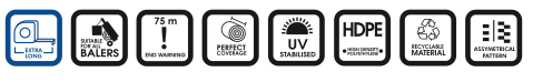 EFFI‑BALESMARTima značilen, asimetričen vzorec v oranžni in modri barvi, ki omogoča enostavno kontrolo razporeditve mreže na bali in njeno namestitev v stiskalnico med baliranjem. Ima tudi 75‑metrsko opozorilo o koncu mreže, ki preprečuje, da bi mreža zmanjkala, ko najmanj pričakujete. Mreža je izdelana iz HDPE materiala, ki ga je mogoče 100% reciklirati.